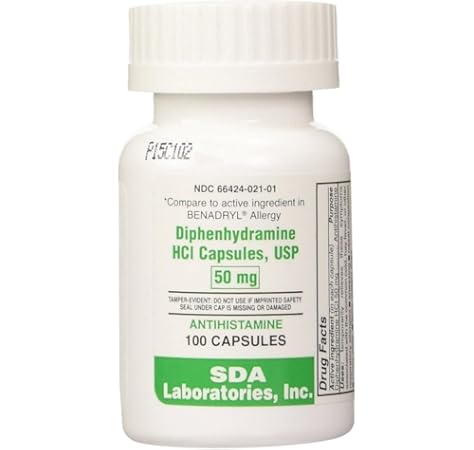 Typical dosage for adults. Each tablet contains diphenhydramine hydrochloride 50 mg. What drugs substances or supplements interact with benadryl. Helps with itchy throat.